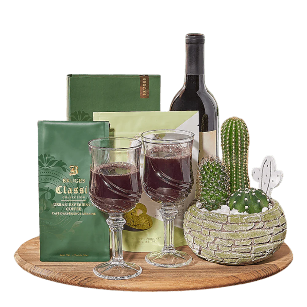 Wrap your loved ones in warmth with A Cozy Welcome Home Gift Set! Bursting with comfort and hospitality, this basket features a bottle of wine, a box of chocolate bars, coffee, matcha green tea cookies, two wine glasses, and a potted trio of cacti, all nestled on a charming wooden cutting board.