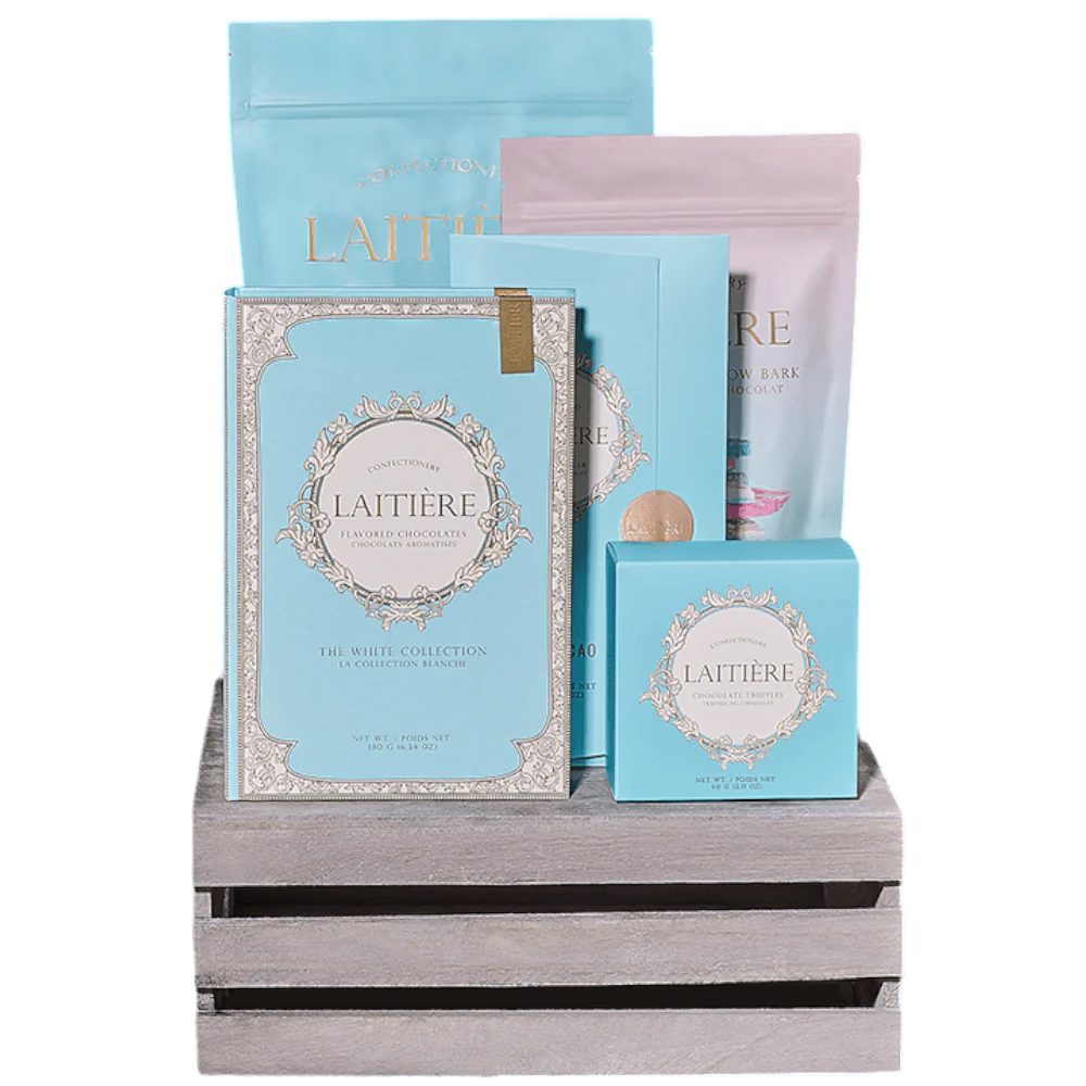Satisfy your sweet tooth with the Absolute Chocolate Smorgasbord Gift Basket from Vancouver Baskets. Indulge in a decadent array of chocolates including rainbow chocolate bark, dark chocolate bars, white chocolate caramel popcorn, a dark chocolate bar, chocolate truffles, and a wooden gift crate.