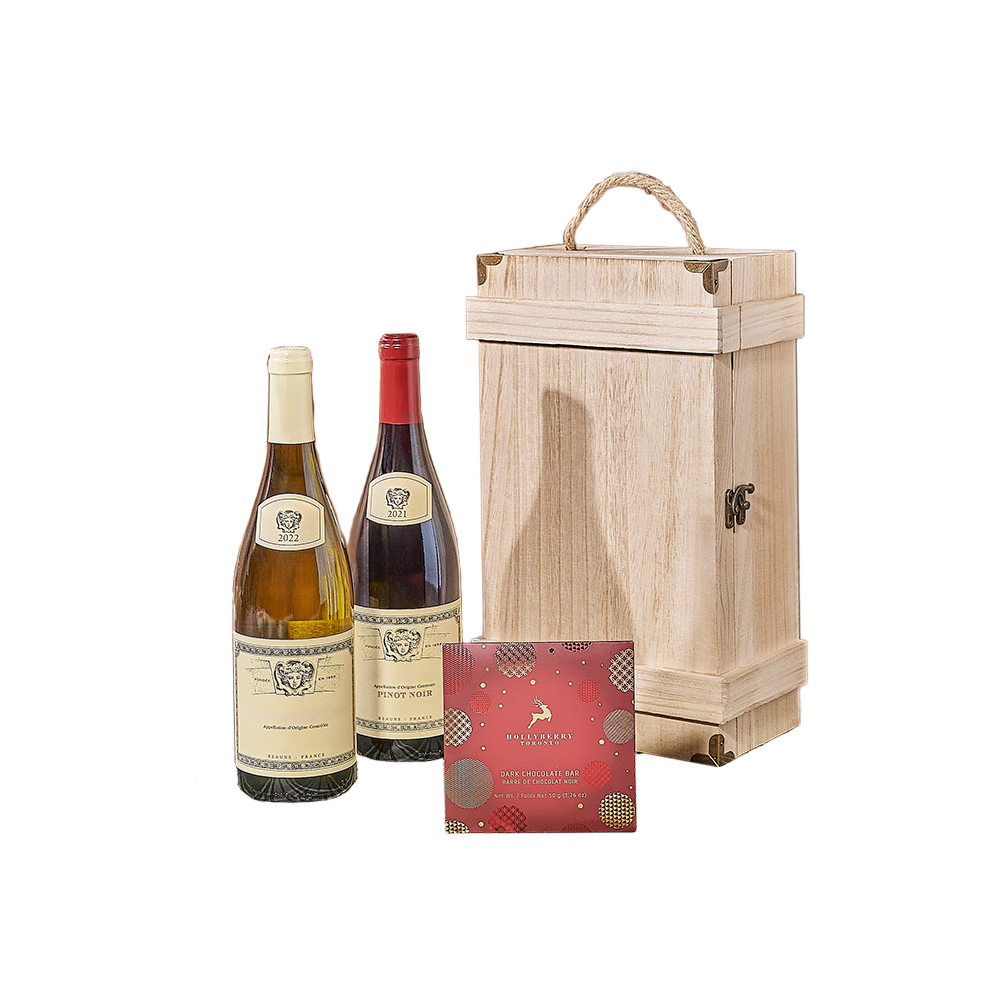 Delight the wine enthusiast on your holiday list with the Christmas Wine Duo gift set from Vancouver Baskets. Featuring two bottles of wine, a bar of dark chocolate bar, and a wooden gift box, it's a perfect blend of elegance and indulgence.