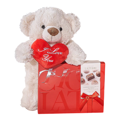 Enhance any date night, anniversary, birthday, or special occasion with the Maryvale Bear & Truffle Gift from Vancouver Baskets. Indulge in a box of assorted chocolate truffles and a charming plush teddy bear holding a heart that reads, ‘I love you.'