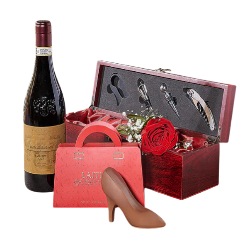 With the Rose and Wine Gift Box from Vancouver Baskets, indulge in a gift worth sharing. This charming gift features a bottle of wine, a beautiful red rose, milk chocolate high heels, and a lovely wine serving box that includes wine serving and storage tools in the lid