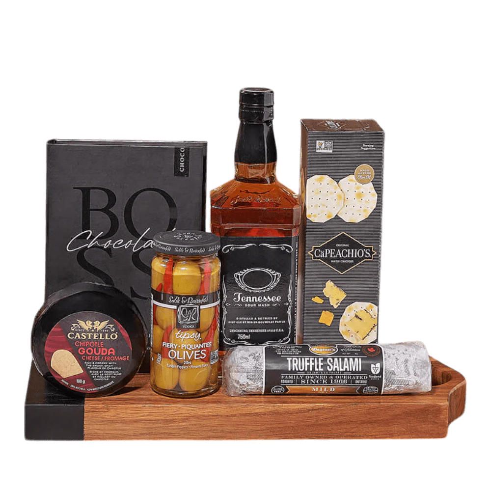 Elevate your next gathering or surprise someone special with the Salami, Cheese & Liquor Board from Vancouver Baskets. This opulent gift is filled with decadent gourmet delights fit for royalty. Indulge in a bottle of liquor, crackers, chipotle gouda cheese, truffle salami, tipsy fiery olives, a box of chocolate bars, and a lovely wooden serving board.
