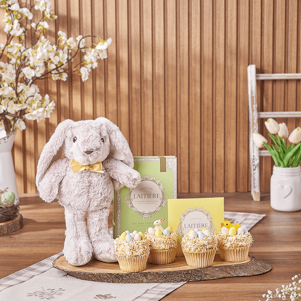 An exceptional way to show you care, the Easter Bunny & Cupcake Gift is perfect for sharing with friends and family no matter the distance. This gift includes a plush bunny toy, a box of filled chocolate bars, a dark chocolate bar, four Easter cupcakes decorated with candy eggs and coconut nests, and a live-edge serving board. Of course, you may add on wine, champagne, gourmet snacks, and more from our custom options.