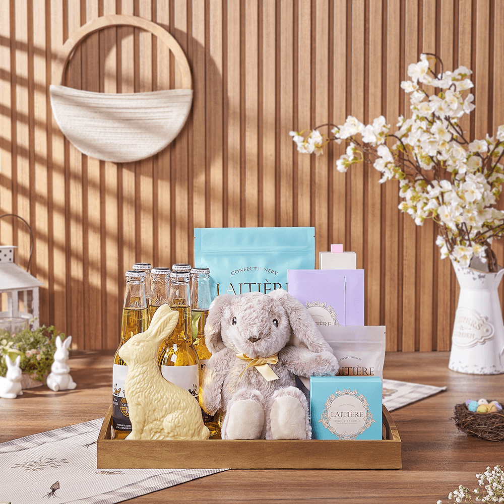 With a little something for everyone, the Festive Easter Beer & Candy Tray is a charming gift set that is sure to be a hit with loved ones near and far! This gift includes six bottles of beer, a plush bunny toy, a white chocolate bunny, white chocolate caramel popcorn, a dark chocolate bar, assorted chocolate truffles, white chocolate truffles, cherry cream ring candies, and a wooden serving tray. Of course, you may add on your choice of wine, champagne, gourmet snacks, and more from our extensive custom options.